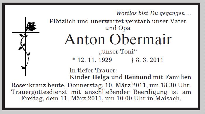 Gottesdienst am Freitag, dem 11. März 2011, um 10:00 Uhr in St. Vitus, Maisach Beerdigung anschließend im Friedhof Maisach