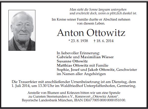 Die Trauerfeier ist am Dienstag, dem 1. Juli 2014, um 13:30 Uhr im Germering - Waldfriedhof Unterpfaffenhofen |