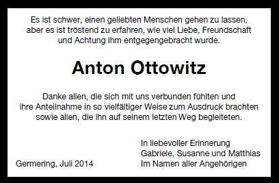 Wir trauern um Herrn Anton Ottowitz Technischer Angestellter * 23.08.1938 † 18.06.2014 |