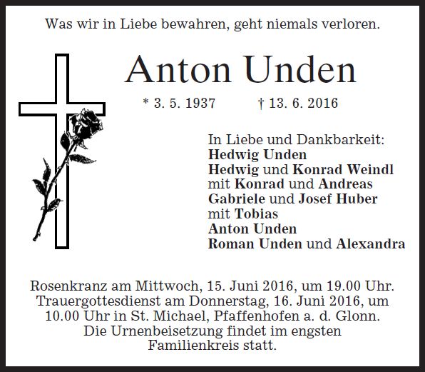 Wir trauern um Herrn Anton Unden Baggerführer * 03.05.1937 † 13.06.2016 |