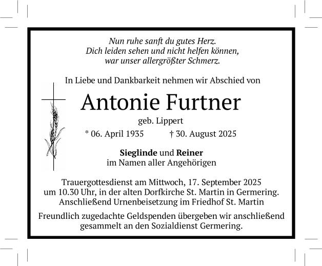 Wir trauern um Frau Antonie Furtner geb. Lippert * 06.04.1935 † 30.08.2025 |