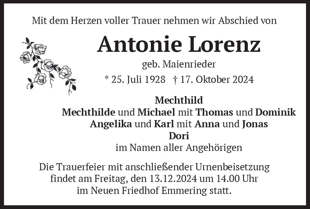 Wir trauern um Frau Antonie Lorenz * 25.07.1928 † 17.10.2024 |