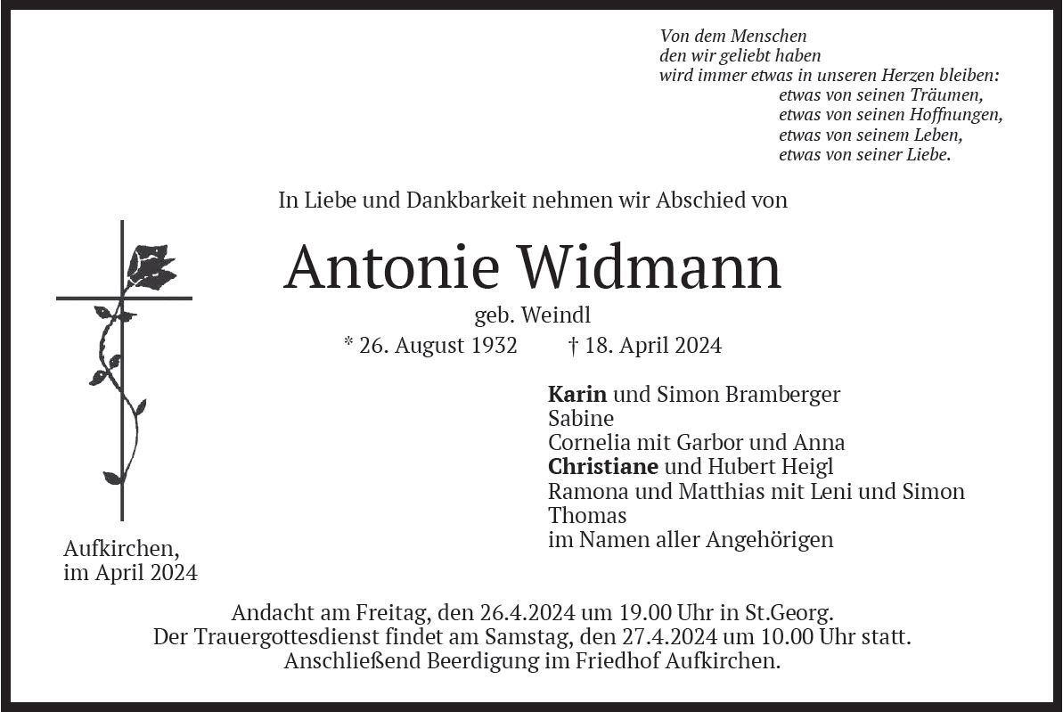 Wir trauern um Frau Antonie Widmann geb. Weindl * 26.08.1932 † 18.04.2024 |
