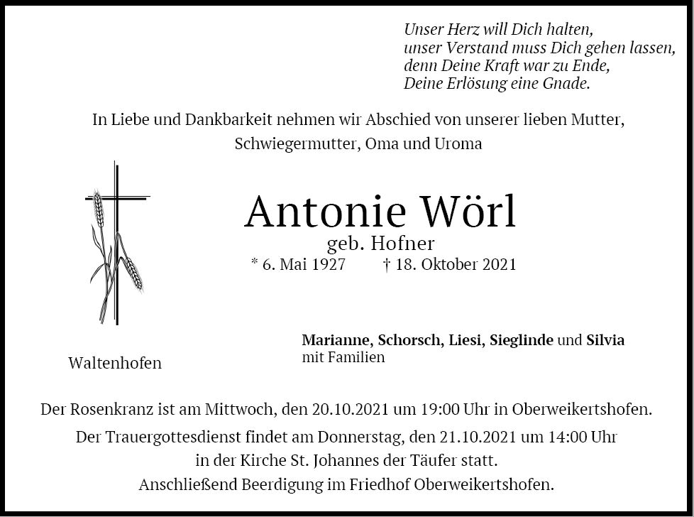 Wir trauern um Frau Antonie Wörl geb. Hofner * 06.05.1927 † 18.10.2021 |