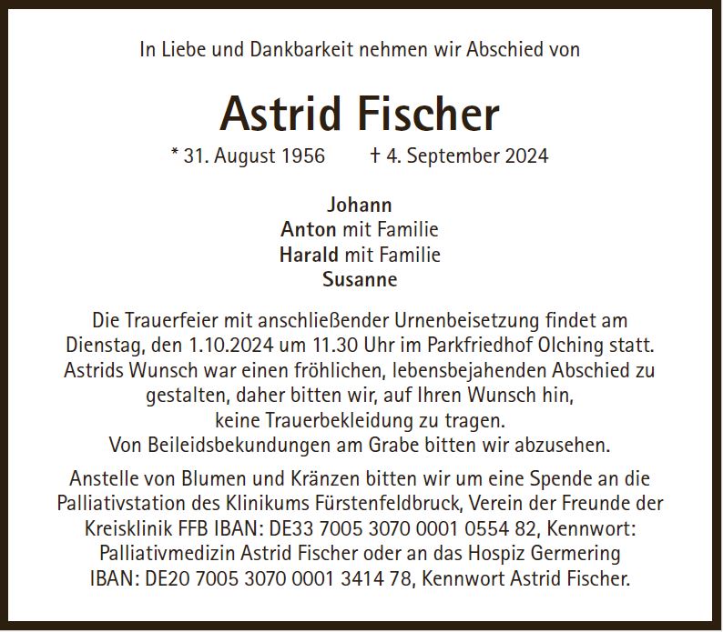 Die Trauerfeier mit anschließender Urnenbeisetzung findet am Dienstag, den 1.10.2024 um 11.30 Uhr im Parkfriedhof Olching statt. Astrids Wunsch war einen fröhlichen, lebensbejahenden Abschied zu gestalten, daher bitten wir, auf Ihren Wunsch hin, keine Trauerbekleidung zu tragen. Von Beileidsbekundungen am Grabe bitten wir abzusehen. |