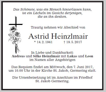 Das Requiem findet am Mittwoch, den 7.6.2017 um 10:00 Uhr in der Kirche, St. Jakob Germering, statt. Die Urnenbeisetzung ist im Anschluß im Friedhof St. Jakob, Germering.