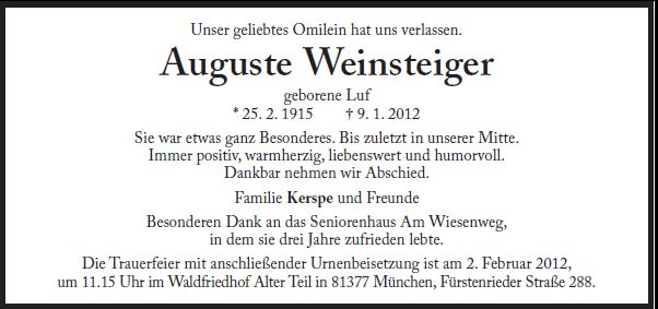 Wir trauern um Frau Auguste Weinsteiger geb. Luf Kfm. Angestellte * 25.02.1915 † 09.01.2012 |