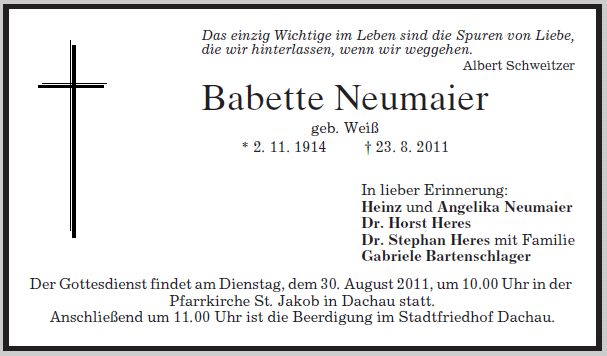 Gottesdienst am Dienstag, dem 30. August 2011, um 10:00 Uhr in St. Jakob, in Dachau Beerdigung am Dienstag, dem 30. August 2011, um 11:00 Uhr im Dachauer Stadtfriedhof
