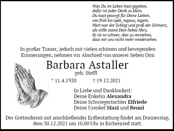 Gottesdienst am Donnerstag, dem 30. Dezember 2021, um 10:00 Uhr in der Pfarrkirche Unsere liebe Frau im Moos. Beerdigung am Donnerstag, dem 30. Dezember 2021, um 10:45 Uhr im Friedhof Eschenried.