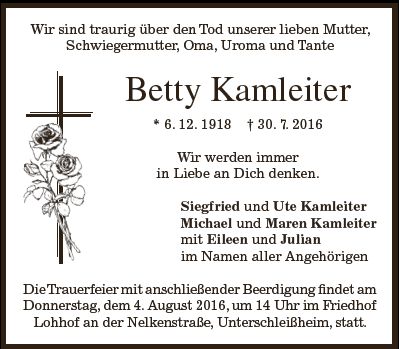 Wir trauern um Frau Barbara Kamleiter geb. Spießl Hausfrau * 06.12.1918 † 30.07.2016 |