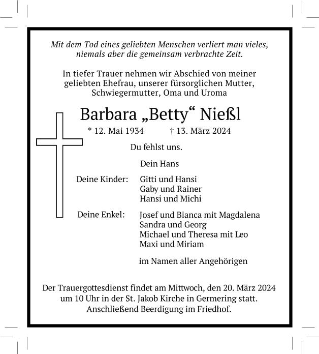 Wir trauern um Frau Barbara Nießl geb. Bernlochner * 12.05.1934 † 13.03.2024 |