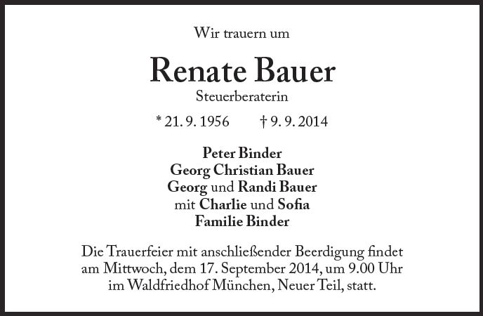 Wir trauern um Frau Bauer Renate Steuerberaterin * 21.09.1956 † 09.09.2014 |