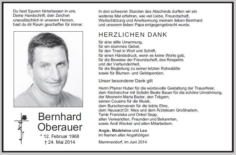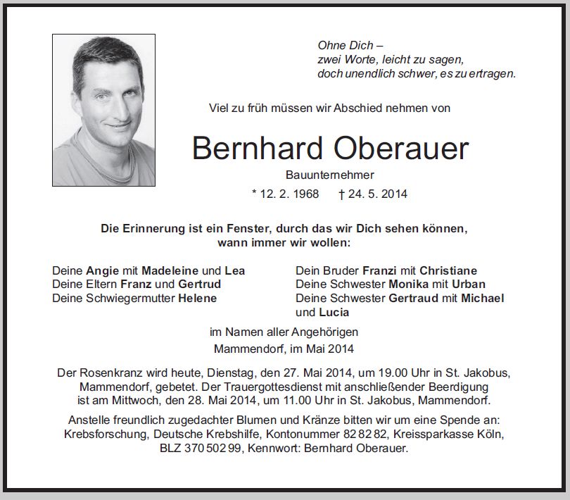 Wir trauern um Herrn Bernhard Oberauer Bauunternehmer * 12.02.1968 † 24.05.2014 |