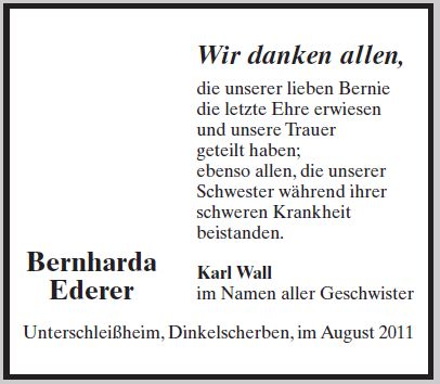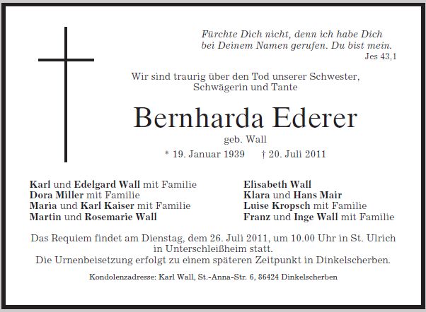 Gottesdienst am Dienstag, dem 26. Juli 2011, um 10:00 Uhr in St. Ulrich in Unterschleißheim Die Urnenbeisetzung erfolgt zu einem späteren Zeitpunkt in Dinkelscherben.