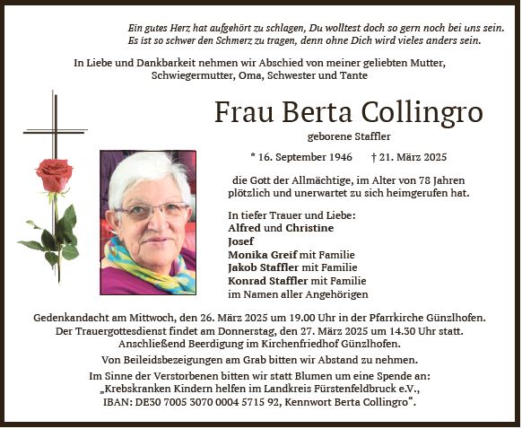 Wir trauern um Frau Berta Collingro geb. Staffler * 16.09.1946 † 21.03.2025 |
