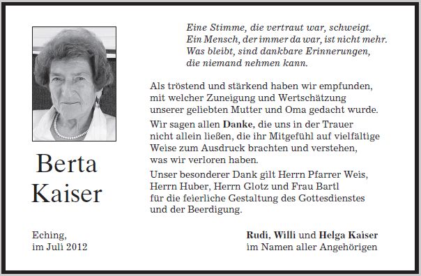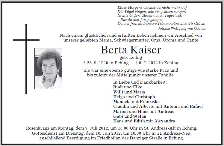 Gottesdienst am Dienstag, dem 10. Juli 2012, um 10:00 Uhr in St. Andreas-Neu in Eching Bererdigung anschließend im Friedhof an der Danziger Strasse in Eching