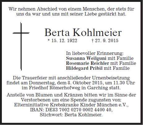 Wir trauern um Frau Berta Kohlmeier geb. Bosl Haushälterin * 15.12.1922 † 27.09.2015 |