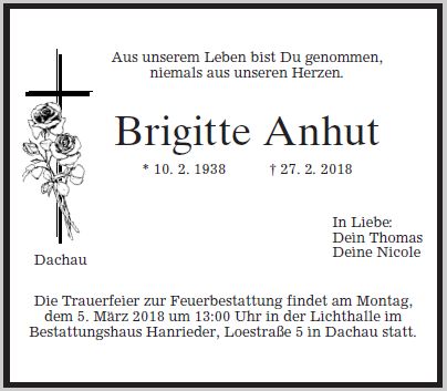 Die Trauerfeier findet am Montag, dem 5. März 2018, um 14:00 Uhr im Hanrieder Bestattungshaus, Loestraße 5 in Dachau statt. Die Urnenbeisetzung erfolgt zu einem späteren Zeitpunkt im engsten Familienkreis. |