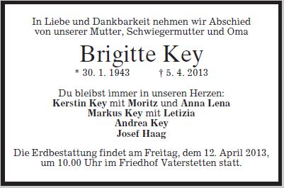Beerdigung am Freitag, dem 12. April 2013, um 10:00 Uhr im Friedhof Vaterstetten.