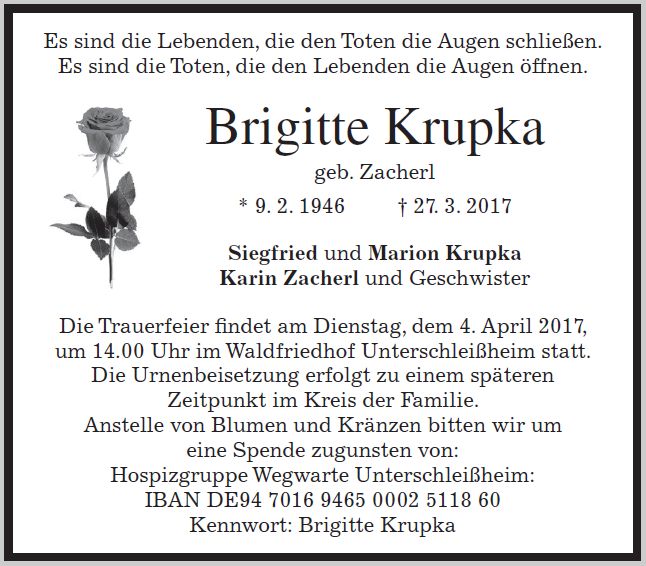 Trauerfeier am Dienstag, dem 04.04.2017 um 14:00 Uhr im Waldfriedhof Unterschleißheim