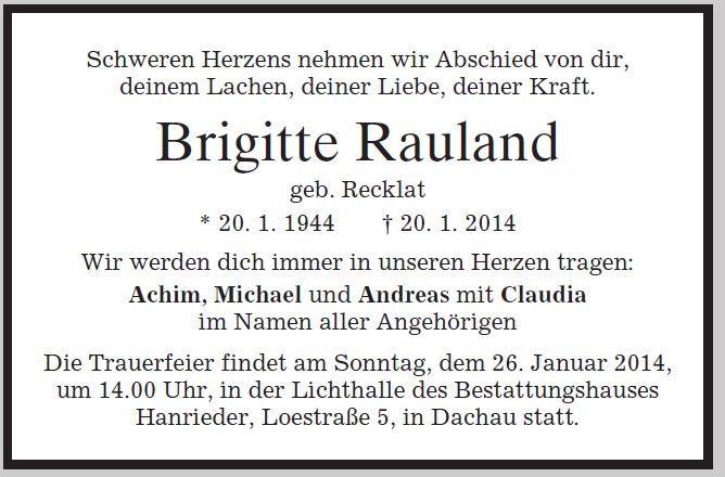 Trauerfeier am Sonntag, dem 26. Januar 2014, um 14:00 Uhr in der Lichthalle, Hanrieder Bestattungshaus Beisetzung am Freitag, dem 7. Februar 2014, um 15:00 Uhr im Waldfriedhof Dachau