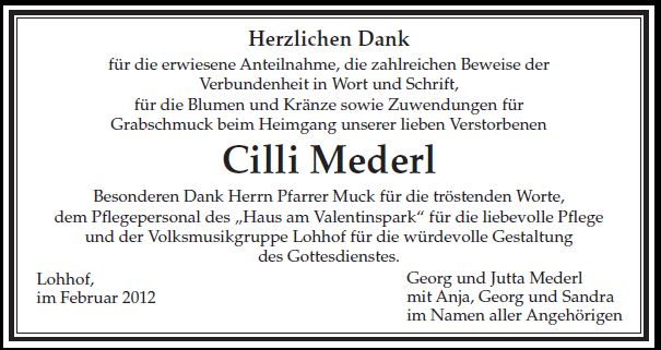 Gottesdienst am Freitag, dem 3. Februar 2012, um 14:00 Uhr in St. Ulrich, alte Kirche Anschließend Beerdigung im alten Kirchenfriedhof Unterschleißheim