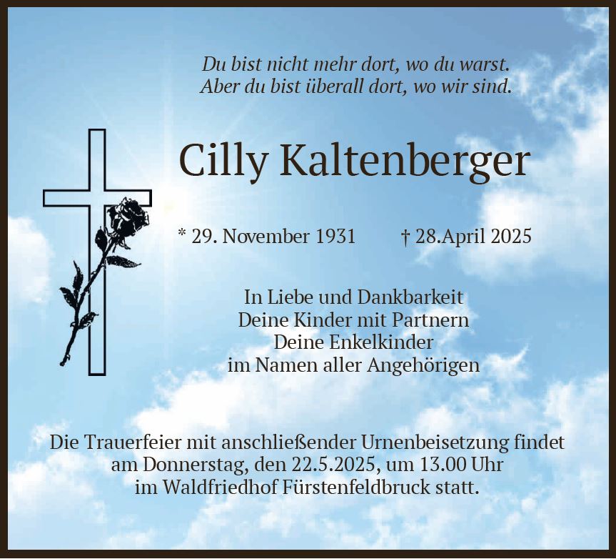 Wir trauern um Frau Cäzilie Kaltenberger geb. Strasser * 29.11.1931 † 28.04.2025 |