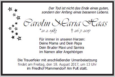 Wir trauern um Frau Carolin Haas geb. Haas Kinderpflegerin * 21.02.1983 † 26.07.2017 |