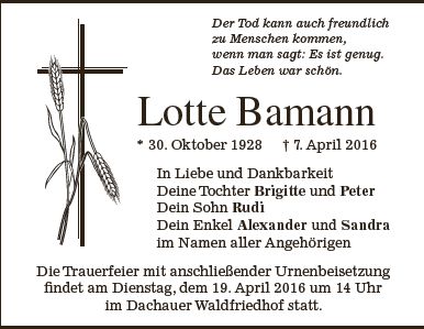 Wir trauern um Frau Charlotte Bamann geb. Mayr-Hörmann Modistin * 30.10.1928 † 07.04.2016 |