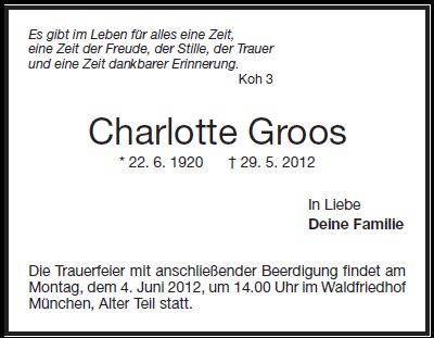 Wir trauern um Frau Charlotte Groos geb. Seybold Krankenschwester * 22.06.1920 † 29.05.2012 |