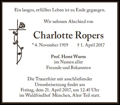 Trauerfeier mit anschließender Urnenbeisetzung am Freitag, dem 21. April 2017, um 12:45 Uhr im Waldfriedhof München Alter Teil |