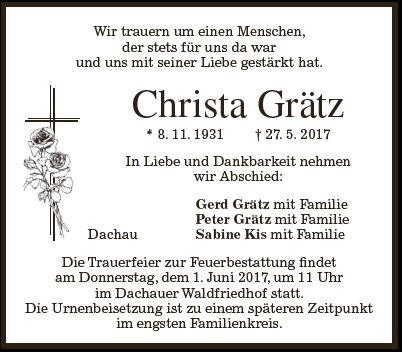 Trauerfeier zur Feuerbestattung am Donnerstag, dem 1. Juni 2017, um 11:00 Uhr im Dachauer Waldfriedhof. Die Urnenbeisetzung findet zu einem späteren Zeitpunkt im engsten Familienkreis statt. |