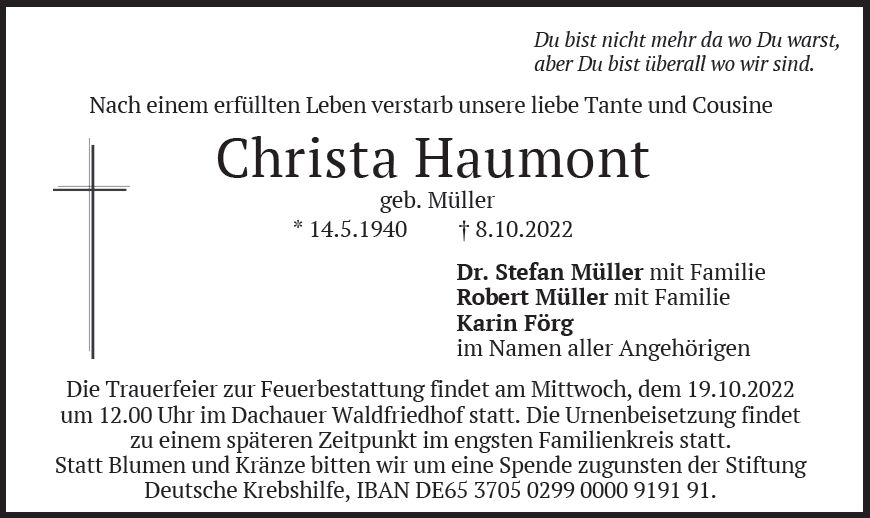 Trauerfeier am Mittwoch, dem 19. Oktober 2022, um 12:00 Uhr im Dachauer Waldfriedhof. Die Urnenbeisetzung folgt zu einem späteren Zeitpunkt im engsten Familienkreis.