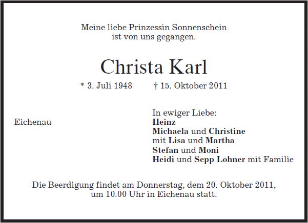 Beerdigung am Donnerstag, dem 20. Oktober 2011, um 10:00 Uhr in Eichenau.