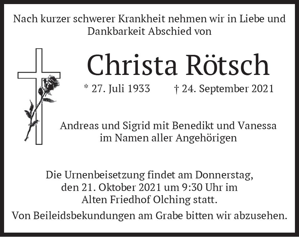 Wir trauern um Frau Christa Rötsch geb. Gmelch * 27.07.1933 † 24.09.2021 |
