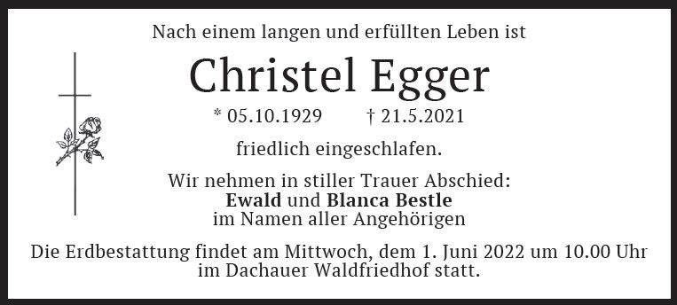 Trauerfeier mit anschließender Erdbestattung am Mittwoch, dem 1. Juni 2022, um 10:00 Uhr im Dachauer Waldfriedhof.