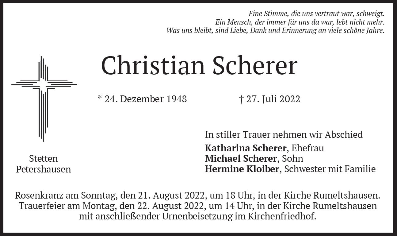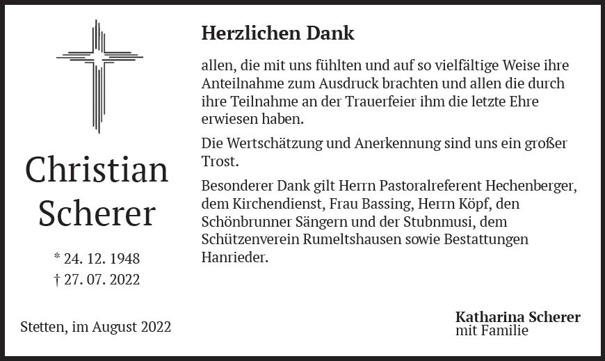 Wir trauern um Herrn Christian Scherer * 24.12.1948 † 27.07.2022 |