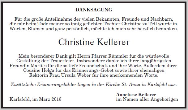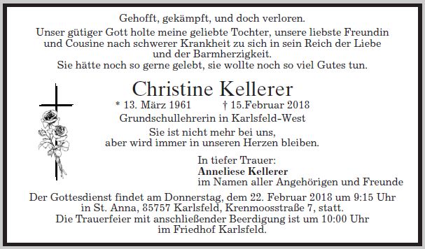 Der Gottesdienst findet am Donnerstag, dem 22. Februar 2018, um 09:15 Uhr in St. Anna statt. Die Trauerfeier mit anschließender Beerdigung ist am Donnerstag, dem 22. Februar 2018, um 10 Uhr im Friedhof Karlsfeld.