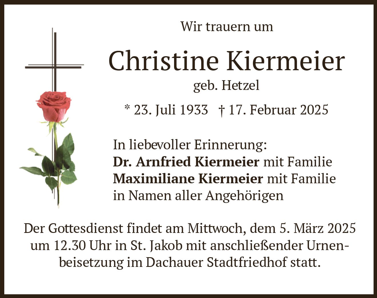 Gottesdienst am Mittwoch, dem 5. März 2025, um 12:30 Uhr in Dachau, St. Jakob. Beisetzung am Mittwoch, dem 5. März 2025, um 13:30 Uhr im Dachauer Stadtfriedhof.