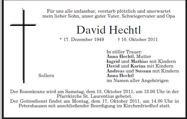Gottesdienst am Montag, dem 17. Oktober 2011, um 14:00 Uhr in Petershausen Beerdigung anschließend im Kirchenfriedhof