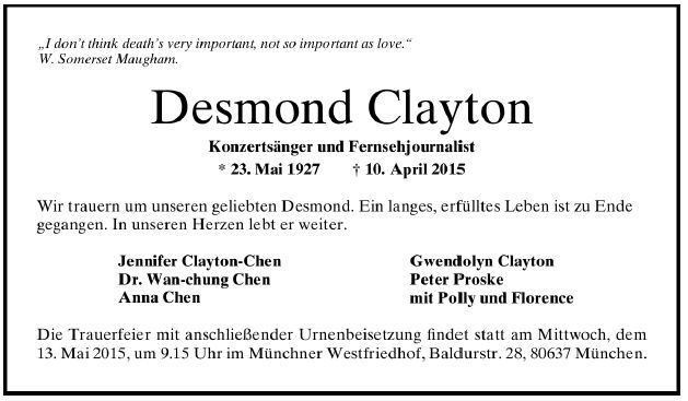 Trauerfeier mit anschließender Urnenbeisetzung am Mittwoch, dem 13. Mai 2015, um 09:00 Uhr im Münchner Westfriedhof