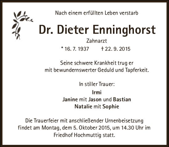 Trauerfeier mit anschließender Urnenbeisetzung am Montag, dem 5. Oktober 2015, um 14:30 Uhr im Friedhof Hochmutting
