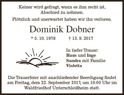 Wir trauern um Herrn Dominik Dobner technischer Angestellter * 05.10.1978 † 13.09.2017 |
