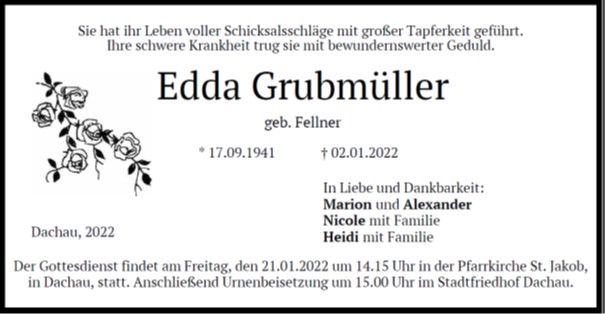 Gottesdienst am Freitag, den 21. Januar 2022, um 14:15 Uhr in St. Jakob, Dachau Anschließend Urnenbeisetzung im Dachauer Stadtfriedhof