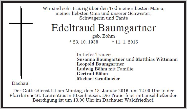 Der Gottesdienst ist am Montag, dem 18. Januar 2016, um 12:00 Uhr in der Pfarrkirche Etzenhausen. Die Trauerfeier mit anschließender Beerdigung ist um 13:00 Uhr im Dachauer Waldfriedhof.