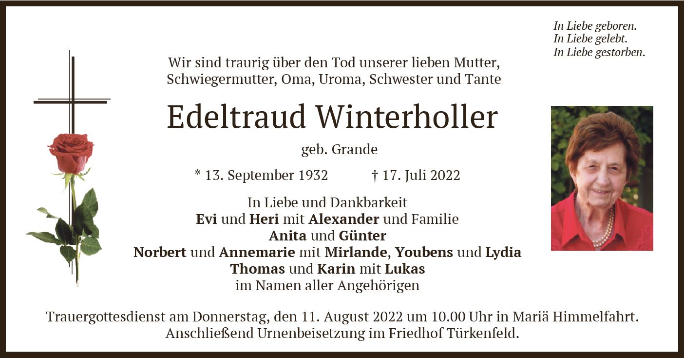Wir trauern um Frau Edeltraud Winterholler geb. Grande * 13.09.1932 † 17.07.2022 |
