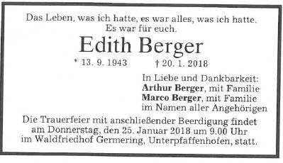 Die Trauerfeier mit anschießender Beerdigung ist am Donnerstag, den 25.1.2018 um 9 Uhr, im Waldfriedhof Germering, Unterpfaffenhofen |