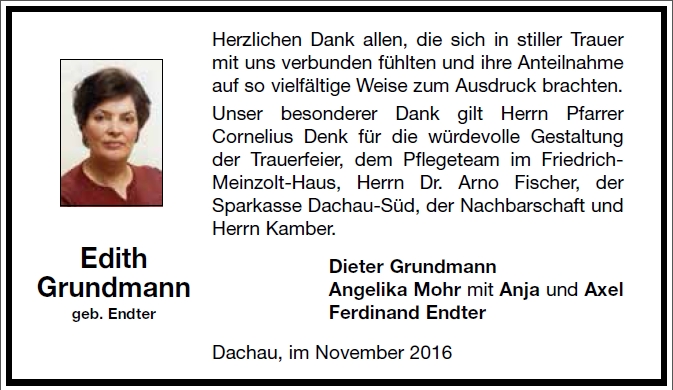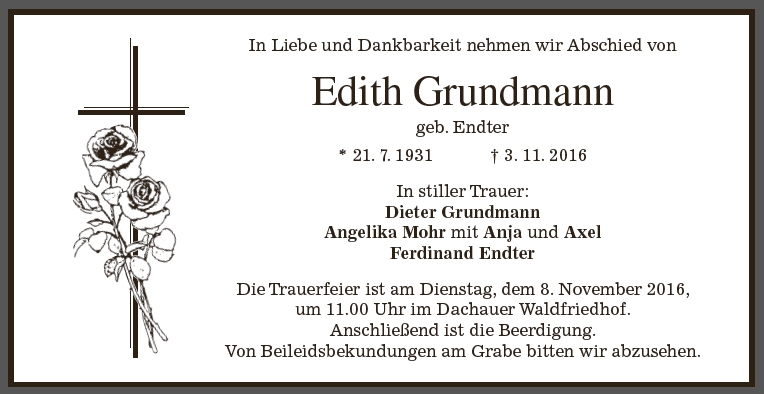 Die Trauerfeier ist am Dienstag, dem 8. November 2016, um 11.00 Uhr im Dachauer Waldfriedhof. Anschließend ist die Beerdigung.
