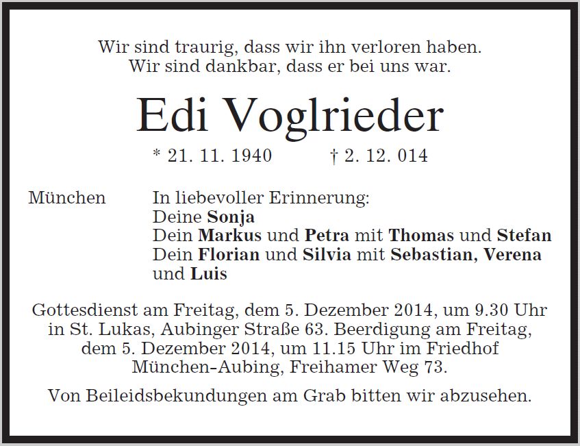 Gottesdienst am Freitag, dem 5. Dezember 2014, um 9.30 Uhr in St. Lukas, Aubinger Str. 63 Beerdigung am Freitag, dem 5. Dezember 2014, um 11:15 Uhr im Friedhof München Aubing, Freihamer Weg 73