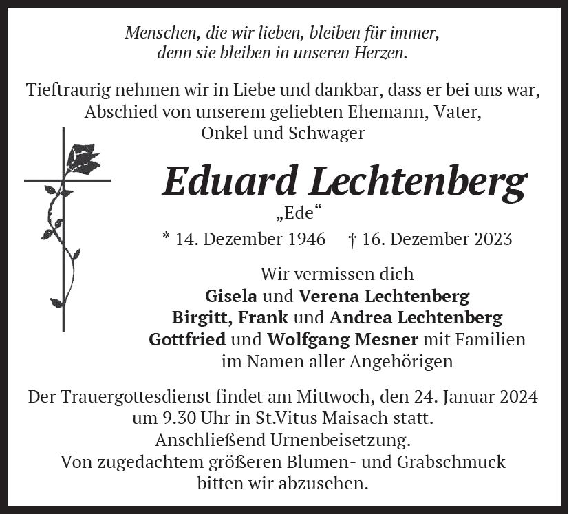 Wir trauern um Herrn Eduard Lechtenberg * 14.12.1946 † 16.12.2023 |